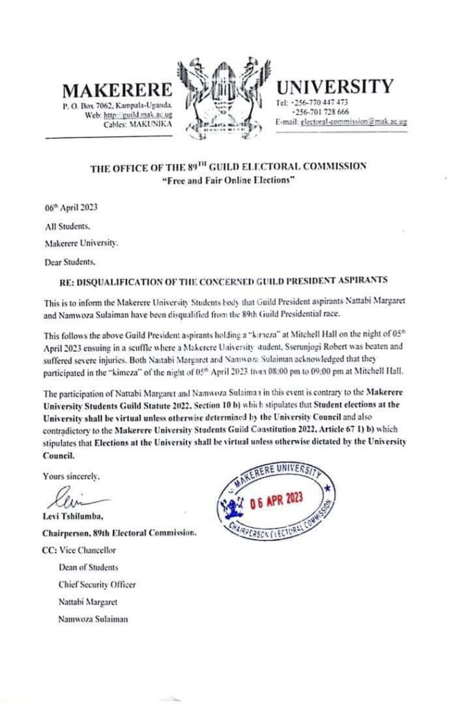 JBMuwonge: This letter arrived in my inbox around 7:00am today disqualifying the National Unity Platform candidate Nattabi Margaret from the Makerere University Guild Election race, as well as one Namwoza Sulaiman, a fellow member of our party who made the difficult decision not to participate in our primaries for fear of being disqualified. All of this follows the enactment of a bizarre statute that bans political parties at Makerere University and makes all elections virtual.
