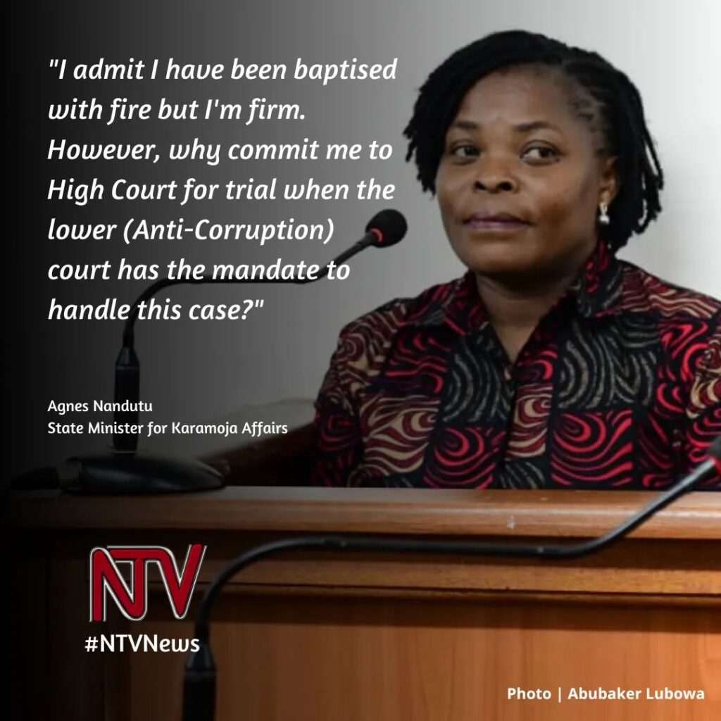 Meanwhile the Kololo anti-corruption court today declined to take a plea from junior Karamoja Minister Agnes Nanduttu and committed her to High Court after state prosecution said investigations into her case are complete.