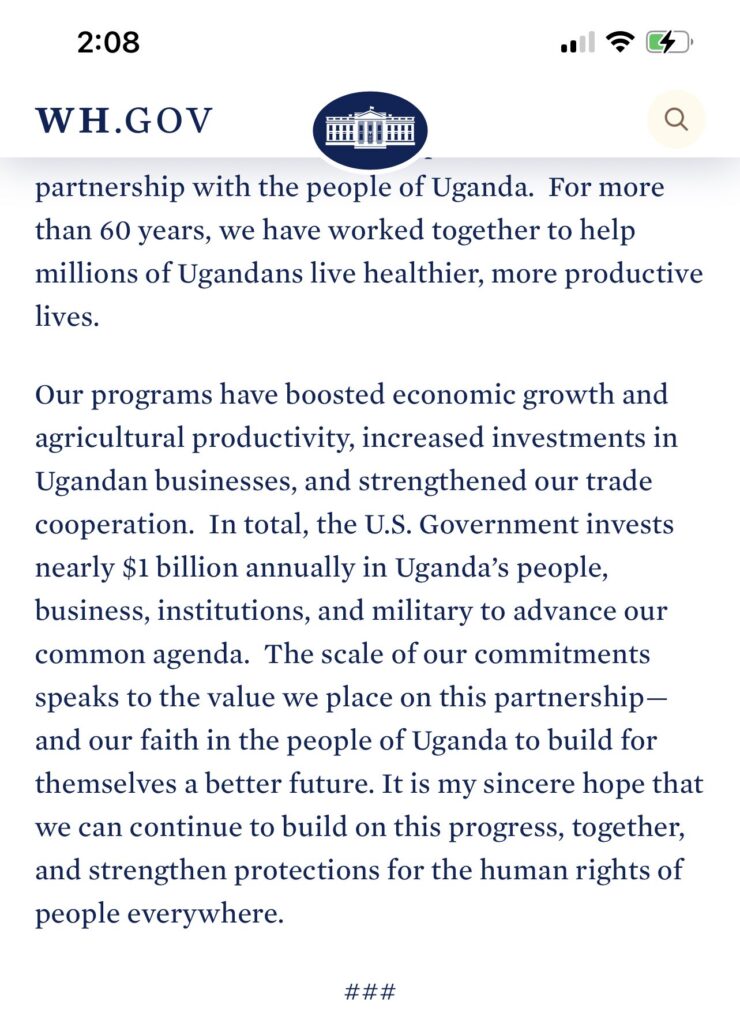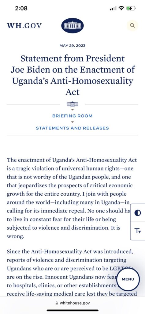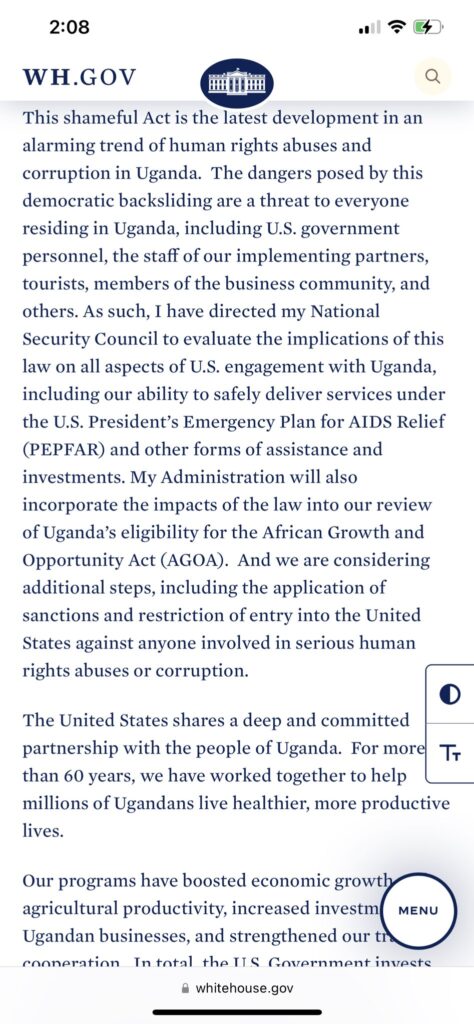 “I have directed my National Security Council to evaluate the implications of this law on all aspects of U.S. engagement with Uganda, including our ability to safely deliver services under the U.S. President’s Emergency Plan for AIDS Relief (PEPFAR) and other forms of assistance and investments. My Administration will also incorporate the impacts of the law into our review of Uganda’s eligibility for the African Growth and Opportunity Act (AGOA). And we are considering additional steps, including the application of sanctions and restriction of entry into the United States against anyone involved in serious human rights abuses or corruption.” a @WhiteHouse statement read.